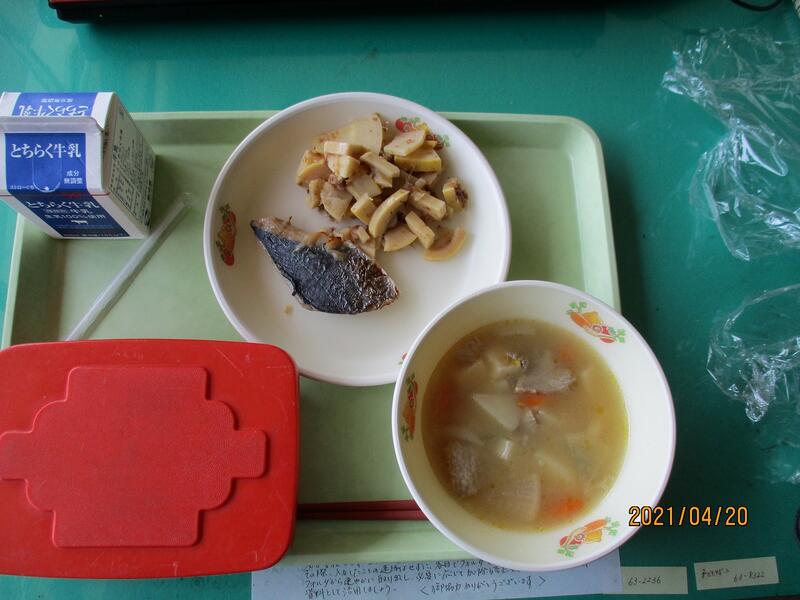 4月20日(火)の給食は、「旬のお魚ランチ」でした。このメニューに付け合わせとして加わったのは、地元の竹林で南摩中学校の生徒が収穫してきたタケノコを使った、「タケノコのおかか和え」でした。南摩地区ならではのこのメニューは、地域の方のご厚意によって実現できたものです。旬の魚に、旬のタケノコを味わい、季節を感じながら食事をすることができました。とてもおいしかったです。