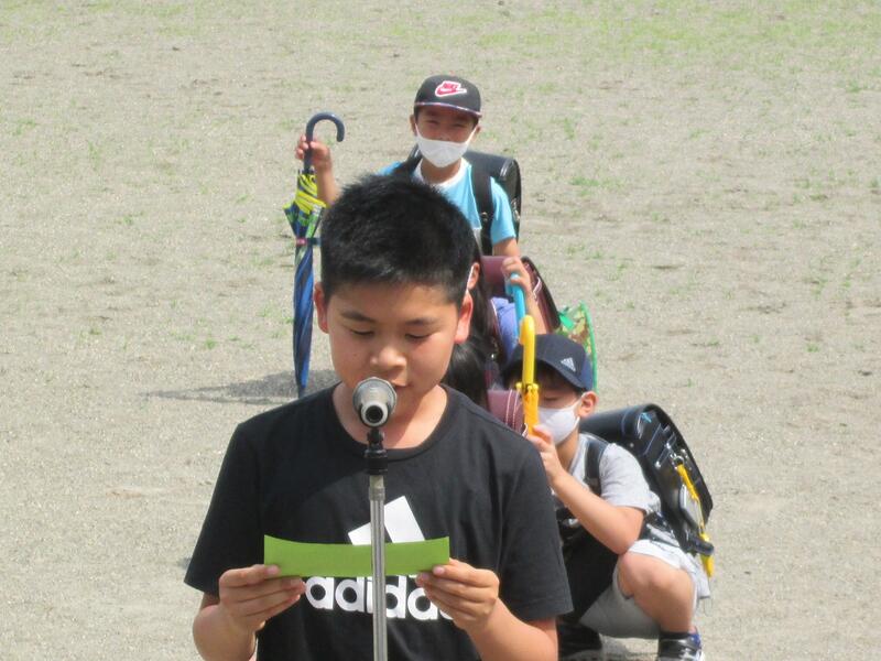 7月19日(月)、この日の朝は、ワックスがけのために廊下に出した机や椅子を教室の中に運び入れる作業をすることになっていました。小さな1年生たちはどうしているのかと、1年生の教室に様子を見に行くと、6年生が手伝いに来てくれていました。さすが6年生、進んで重たい物を運んでくれていました。本当に頼りになる6年生です。 その様子を、見つめる1年生は、きっと「6年生ってすごいな。」と思っていることでしょう。