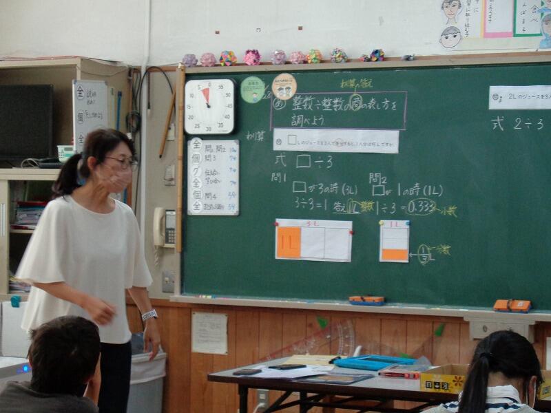 9月28日(水)、5年生は、「分数と小数、整数の関係を調べよう」の学習をしていました。2Lのジュースを3人で分けたとき、分数でどのように表したらよいかを考えていました。図に表しながら、自分の考えを相手に伝えようと、一生懸命説明していました。互いの意見を聞きあいながら、考えを深めている様子がうかがえました。