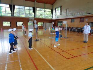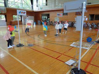 体育館にセットした模擬交差点を使って、正しい横断の仕方を練習しました。