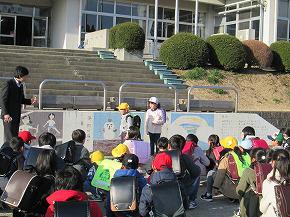 一斉下校前に地区ごとにまとまり、通学班毎の反省し、その後その反省をもとに地区担当の教職員からの指導の話を聞きます。