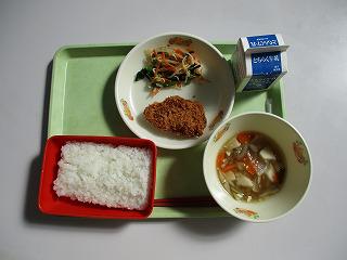 献立は、ご飯、牛乳、モロの味噌カツ、にらのおひたし、吉野汁です。