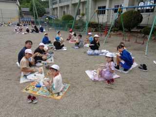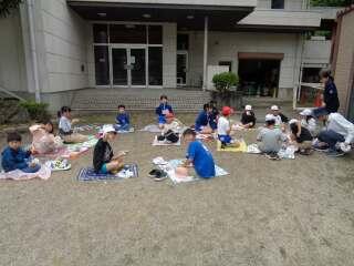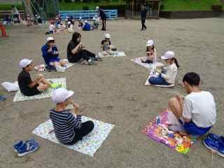 事前に考えておいた場所に、たてわり班ごとに移動し、食事の準備ができた班から食べ始めます。