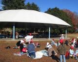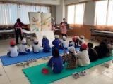 KLVさん作の「きつね村 たぬき村」超大型絵本の読み聞かせがありました。超大型絵本なので、4人がかりでの読み聞かせです。音楽やたいこのお囃子もあり、楽しい時間を過ごすことができました。