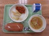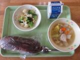 本日の給食の献立は、ココア揚げパン、牛乳、花野菜サラダ、ポトフです。揚げパンは児童の好きなメニューの一つです。