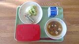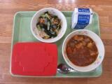 本日の給食は「さつきランチ」です。献立は、ご飯、牛乳、鶏肉のニラソースがけ、のりあえ、かんぴょうのみそ汁、ヨーグルトです。