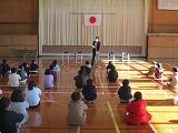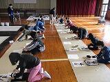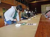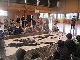 本校の特色である「児童文学者千葉省三ゆかりの地」をテーマに、千葉省三の作品を小杉さんにも読んでいただき、作品のイメージを「書というかたち」で、実演していただきました。また、毛筆を習う3年生以上は書道講座で自分の感じた作品の思いを、体験したことのない大きな紙に書き、学年ごとの共同制作としました。