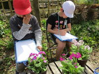成長したアサガオに、肥料を与え、支柱を立ててサポートしました。
