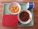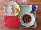 本日の給食の献立は、ご飯、牛乳、麻婆茄子、棒餃子、オレンジです。