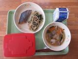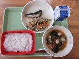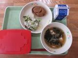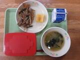本日の給食の献立は、わかめごはん、牛乳、厚焼き玉子、五目きんぴら、みそ汁です。