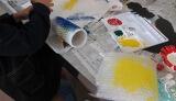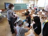 切り抜いたもようの上を色のついたローラーを転がしてデザインしたり、身近にある物をスタンプのように使って模様をつくる授業のようです。とても楽しそうに活動していました。片付けも上手にできるようになり1年生の成長を感じます。