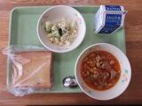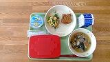 本日の給食の献立は、食パン、チョコ、牛乳、オムレツ、ラタトゥイユ、ラビオリスープです。中学生の大きい牛乳にびっくりですね。