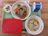 献立は、ご飯、牛乳、厚焼きたまご、しぐれ煮、なめこ汁、ヨーグルトです。