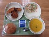 本日の給食は「セレクト給食」です。献立は、丸パン、牛乳、ごぼうサラダ、パンプキンシチュー、セレクトフライ(白身魚フライかメンチカツ)です。写真では二つ写っていますが、児童は自分が選んだもの一つです。