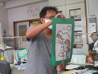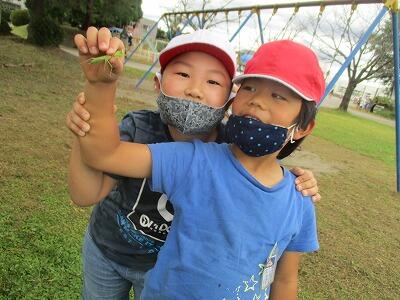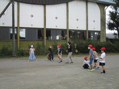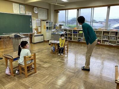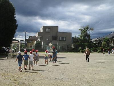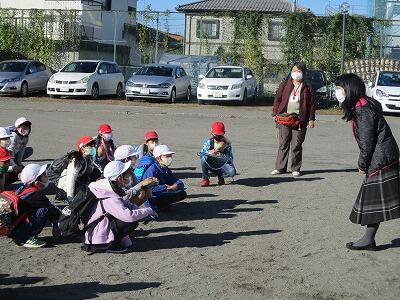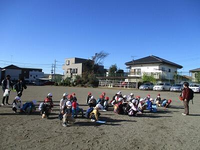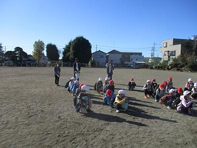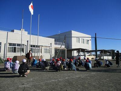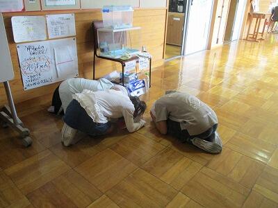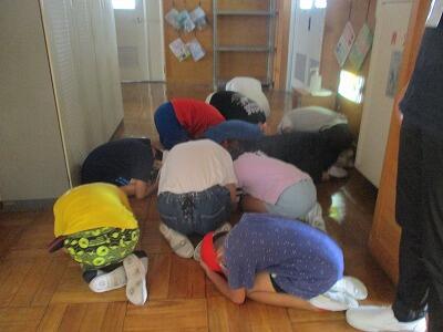 竜巻が起きた時どうするか、の避難訓練を行いました。ダンゴムシのポーズ。みんな覚えていて、すぐできましたか?南押原地区では2014年に竜巻の被害がありました。自然災害はいつ起こるかわかりません。どんなときにも自分の命は自分で守れるようにしましょうね。