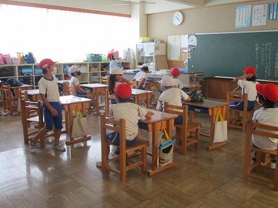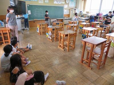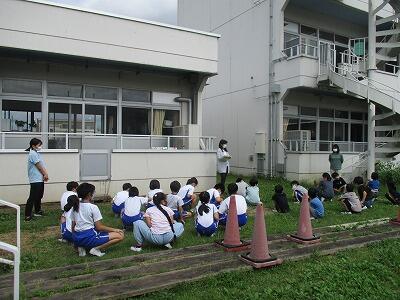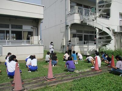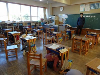 もし、校内に不審な人が入ってきてしまったら、を想定して避難訓練を行いました。始めに不審な人役の先生が教室に入って児童にはイメージを掴んでもらい、どう動けばよいか考えてもらいました。