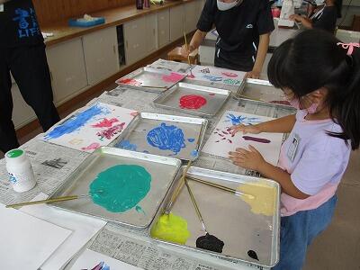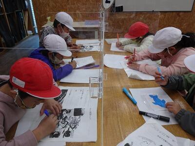 指を使ってのお絵描き。触覚を味わいながら絵の具を指につけ、紙に擦り付けていきます。細部の表現や描き分けは難しいですが、筆を使うより気持ちがダイレクトにあらわされるような気がします。