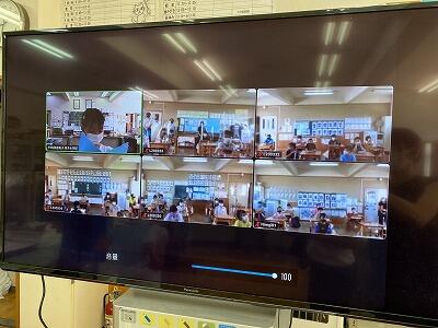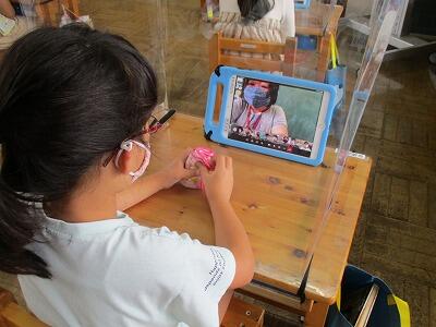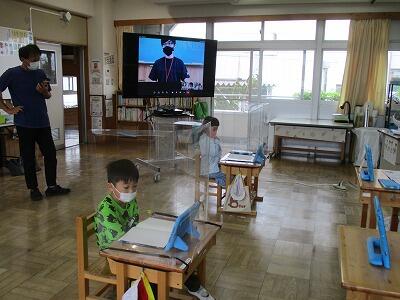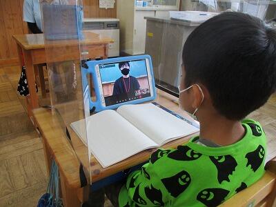 2学期の始業式も緊急事態宣言中ということで、体育館には集まらずに各教室をタブレットでつないで行いました。