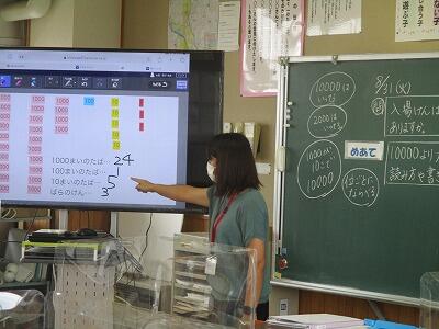 3年生が1000より大きな数の読み方と書き方を勉強しました。今日の先生側のテーマは「効果的な導入とICTの活用」です。子どもたちに人気の「なかがわ水遊園」の入館者数を想定し、タブレットを使って意欲的で活発な学習が展開されました。