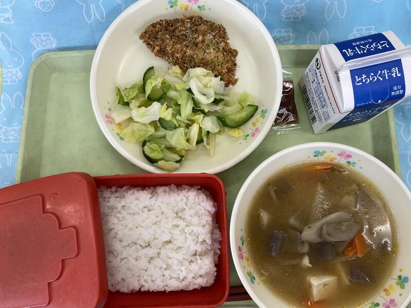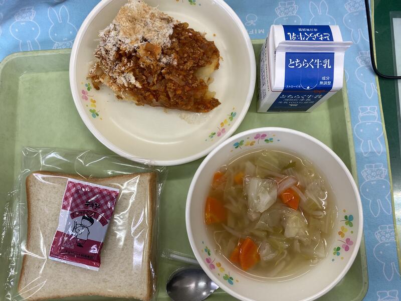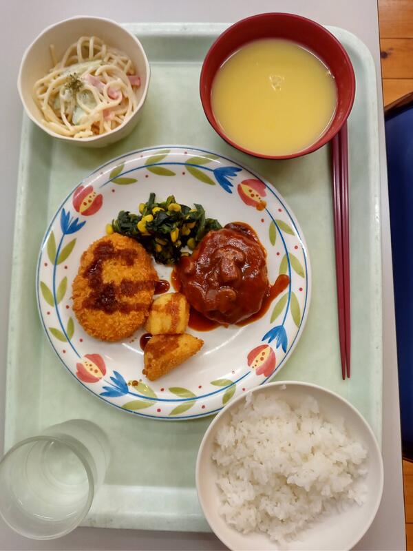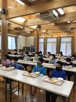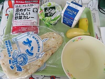 「防災給食」献立です。美味しいカレーでした。ナンもデザートも良かったです。