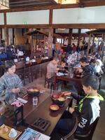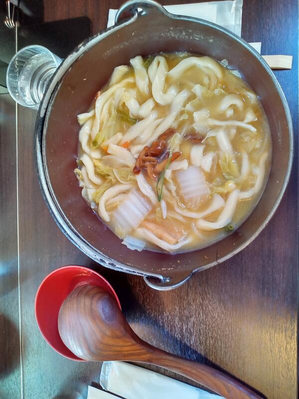 山梨の郷土料理「ほうとう」です。大きな木のおたまを小皿の代わりにしながら食べます。硬めのうどんと様々な野菜を味噌で煮込んでいます。身体があたたまりました〜