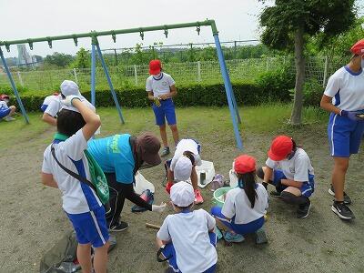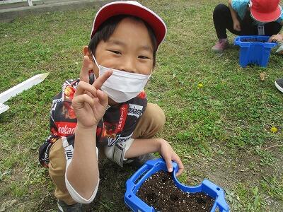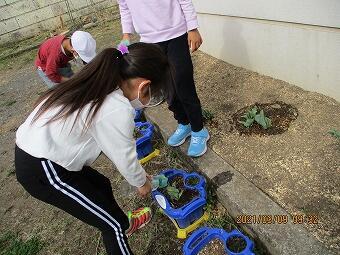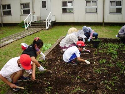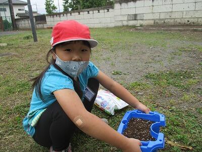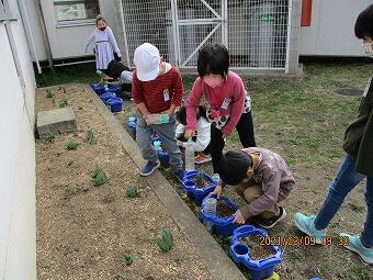 整備していただいた花壇に1年生がアサガオの種をまきました。これから毎日世話をしながら成長を観察していきます。花がたくさん咲くのが楽しみです。