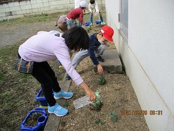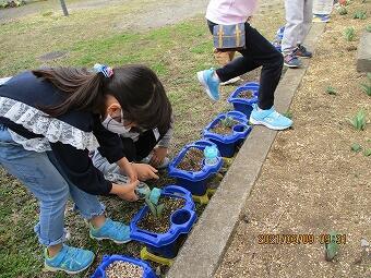 1年生が生活科でチューリップを植えました。新入生を歓迎する気持ちを込めて、どの子も楽しそうに植えていました。