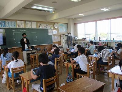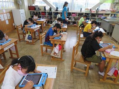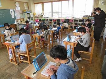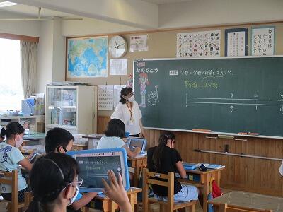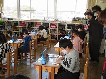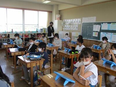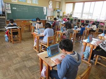 3年生と5年生がタブレットを活用した授業を行いました。3年生はローマ字打ちをしながら、自分自身で考えた文章を打つ学習を、5年生は算数の応用問題をタブレットを活用しながら考える学習を行いました。大学生からタブレットを活用した授業を参観したいとのリクエストがあり行いました。