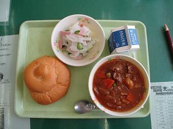給食は黒パン、ツナと大豆のサラダ、クリームシチュー、牛乳でした。