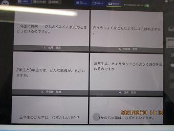 2年生がタブレットに入っているオクリンクというシンキングアプリを使って、3年生への質問を手書きやローマ字打ちで書き込んだりして、みんなの意見を比較しました。
