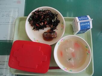 給食は、ごはん、さんま梅煮、五目煮、根菜のごま汁、牛乳でした。