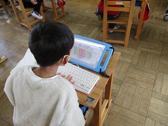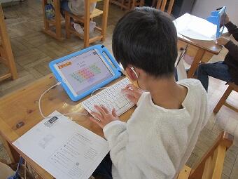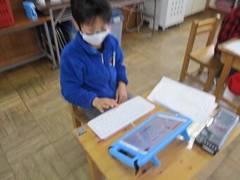 2年生は毎日、朝の学習でタブレットを使いローマ字打ちの練習をしています。子供たちは、学校にくると自分のタブレットを保管庫から取り出して自分のキーボードを取り付け、さっそく練習を始めます。どの子もこの学習がとても好きです。
