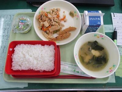 今日の給食は、ごはん、牛乳、さば味噌煮、ごまあえ、のっぺい汁でした。