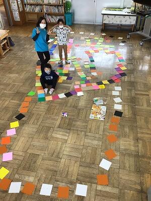 教室中を思い切り使って色紙を並べました。なんの形かな?こうやると、いつもの教室とは違った雰囲気がつくれるんですね。すごいね!
