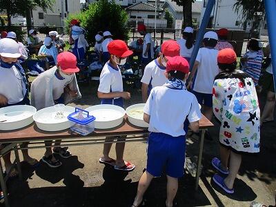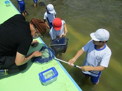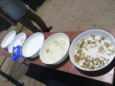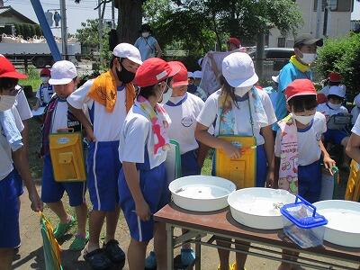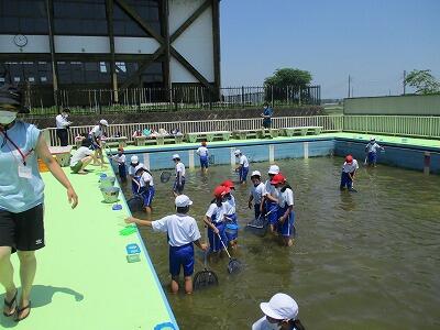 プール掃除の前に、プールの中に住んでいる生き物たちの調査を行いました。調査に協力してくださったのは、虫博士の鹿沼自然観察会の渡辺知義さんです。まだまだ捕り切れませんでしたが、沢山の生き物が集まりました。プールに住んでいる生き物たちは本当は沼や池に住むはずですが、次第に身近にそういった場所がなくなってプールに住もうとしたんだそうです。また、プールは止水なので、そこに住む生き物をプールの水と一緒に川に流しても流水の中では生きられないんだそうです。最後に、渡辺さんから『虫たちにかわって、助けてくれてありがとう!』と言っていただきました。 トンボのこどものヤゴ推定300匹の他、マツモムシ、タニシ、ミズスマシ、アメンボ、絶滅危惧種のミズカマキリ、外来種のアメリカザリガニ