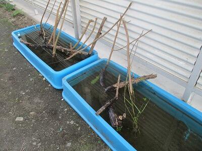 ヤゴの一部を急遽準備したビオトープに!(体育館通路の脇にあります)トンボになるところが見られるかな?