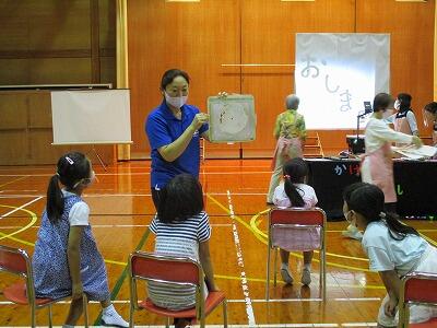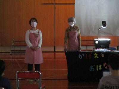 入学、進級おめでとうの気持ちを込めてKLVの皆さんが1、2年生に千葉省三作『ワンワンものがたり』の影絵を見せてくださいました。OHPと手作りシートを使い、手作りシートをその場で動かしながらお話してくださるライブ感と、光の織りなす情景は、テレビやタブレットが当たり前の子どもたちにとって新鮮でイメージを膨らませるよい機会になったと思います。