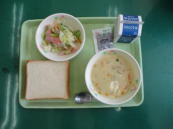 給食は、食パン、いちごジャム、コーンシチュー、ハムマリネサラダ、牛乳でした。