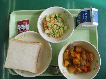 給食は牛乳、麦ご飯、ポークカレー、ほうれん草サラダ、ベビーチーズでした。