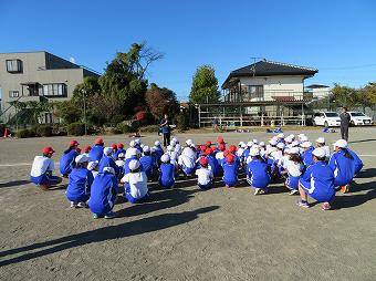持久走練習後、予告なしの避難訓練を行いました。子供たちは緊急地震速報が流れると一斉に固まって避難のポーズ(ダンゴムシポーズ)を取りました。その後、放送の指示に従って、第一避難場所に集まりました。どの子も、予告なしにもかかわらず、真剣に「自分を守る行動」を取ることができました。
