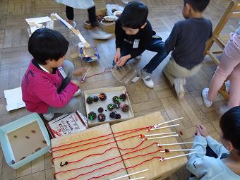 1年生が生活科で「秋のおもちゃ」で遊びました。友達の作ったおもちゃで遊んだり、自分のおもちゃに改良を加えたり、どの子も夢中になって、活動に取り組んでいました。