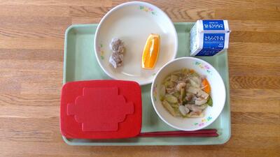 本日の給食の献立は、ごはん、牛乳、八宝菜、ポークしゅうまい、オレンジです。