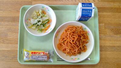 本日の給食の献立は、スパゲティミートソース、牛乳、フレンチサラダ、米粉ドック(チョコ)です。