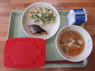 本日の給食の献立は、ごはん、牛乳、あじ一夜干し、塩昆布和え、豚汁です。
