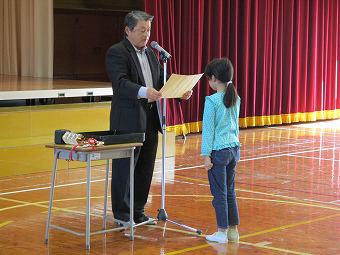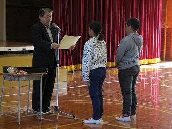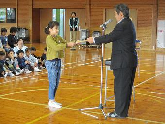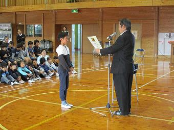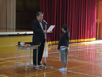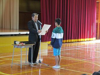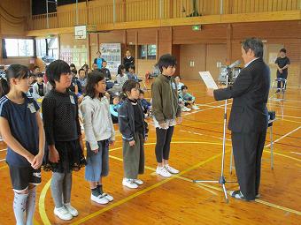 続いて表彰を行いました。夏休みに頑張って作った作品が入賞したり、スポーツ少年団などで活躍したり、おすすめの本を読破したり。それぞれの分野で、一生懸命取り組んだ成果に対する表彰に臨んだ子ども達は、どの子も背筋が伸び、晴れやかな表情をしていました。表彰の詳細は次号の学校だよりでお知らせします。