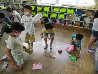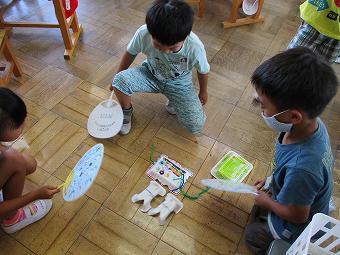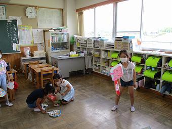1年生が図工で「ふあふあゴー手作りうちわで」の学習をしました。今回は前時までに作り終えた作品を実際にうちわであおいでみんなで楽しく遊びました。