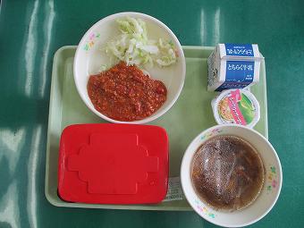 給食は、ごはん、タコライス、ホイルキャベツ、もずくスープ、シークワーサーゼリー、牛乳でした。