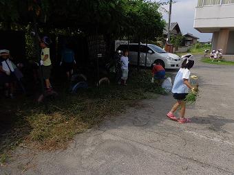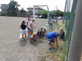 来週日曜日にはPTA奉仕作業が予定されていますが、自分達できれいにできるところはやろう!ということで、毎週木曜日、清掃の時間に全校除草に取り組んでいます。どの学年も自主的に自分達の場所に集まり、除草を始めました。小さな草を丹念に取り除いている子、大きな草を力いっぱい抜いている子。草を集めて袋詰めしている子。どの子も自分の役割を自分で決めて、一生懸命取り組んでいました。