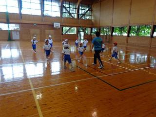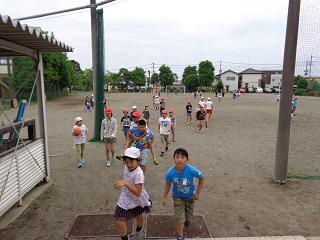 業間の時間に全校体力作りを行いました。体力向上をねらいとして、体力テストと同時期に行います。内容は、どの子も楽しみながら疲れるまで走らせることをねらいとして、1~3年生は体育館で『三本線』を、4~6年生は校庭で『手繋ぎ鬼』をやりました。4~6年生のほうでは、途中から秘密兵器として男性教員が2名、鬼となって参加し、逃げ回っている子を片端から捕まえていました。終了後、どの子も、赤い顔で息を切らしながらも、「たくさん走った人?」という先生の問いに笑顔で手を挙げていました。