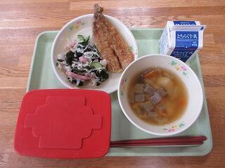 本日の給食の献立は、ごはん、牛乳、いわし蒲焼、切干大根サラダ、根菜のみそ汁です。
